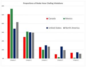 In addition to capturing brake system out-of-service violation data during this year’s Brake Safety Week, inspectors recorded and submitted data regarding the chafing of brake hoses. Inspectors reported levels of brake-hose-chafing violations, separated into five categories based on the level of severity; two of which were out-of-service conditions, three were not.