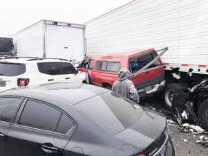 Preliminary estimates show 15-20 commercial motor vehicles and 45 passenger vehicles were involved in the wreck. At least one person was confirmed to have died.