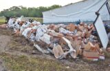 According to the Florida Highway Patrol (FHP), the Wright Brand Bacon truck spilled its entire load after the trailer split apart during the wreck.