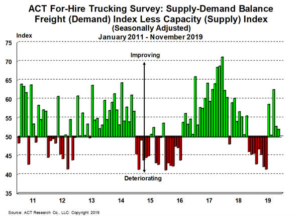 “With some key caveats, we think the string of positive supply-demand results is a positive leading indicator for a capacity rebalancing in 2020,” said Tim Denoyer, ACT Research’s vice president and senior analyst. “The first caveat is that private fleets, the other half of the industry, are not showing the same capacity discipline as the for-hire fleets. The second is that the freight volume outlook remains muted, with a soft manufacturing sector and trade-related inventory overhang likely outweighing relief from the China phase-one deal, which is yet to be signed.”