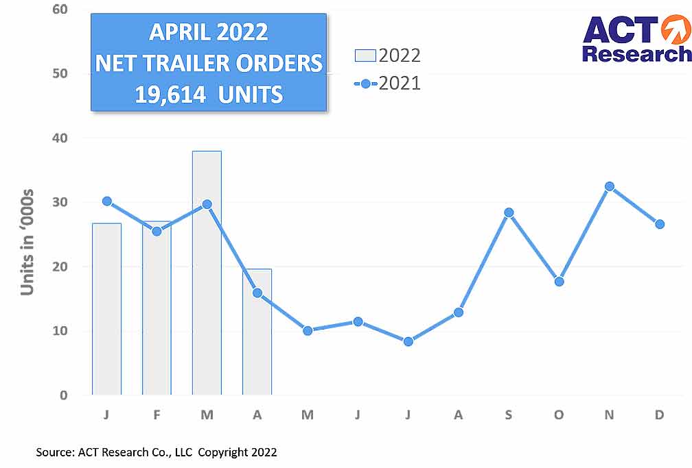 COLUMBUS, Ind. – April net U.S. trailer orders of 19,614 units decreased more than 48% from the previous month, but were 23% higher compared to April of 2021, according to this month’s issue of ACT Research’s State of the Industry: U.S. Trailer Report.