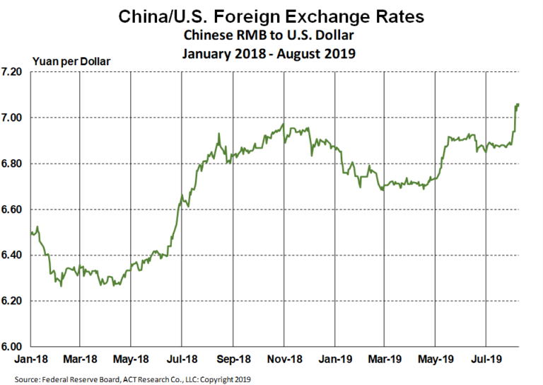 “This month’s chart, the U.S. dollar to Chinese yuan (RMB) illustrates why trade wars are neither good, nor easy to win,” said Kenny Vieth, ACT’s president and senior analyst. “As can be seen, after the U.S. fired the latest salvo in the trade war on August 1, the Chinese responded with in-kind tariffs and a 3% currency devaluation — so far. Since the first ‘shots’ of the trade war were fired on March 1, 2018, the RMB has fallen 12% versus the U.S. dollar.