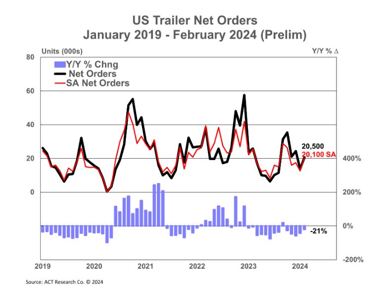 COLUMBUS, Ind. — February’s preliminary net trailer orders increased nominally from January to February, according to ACT Research.