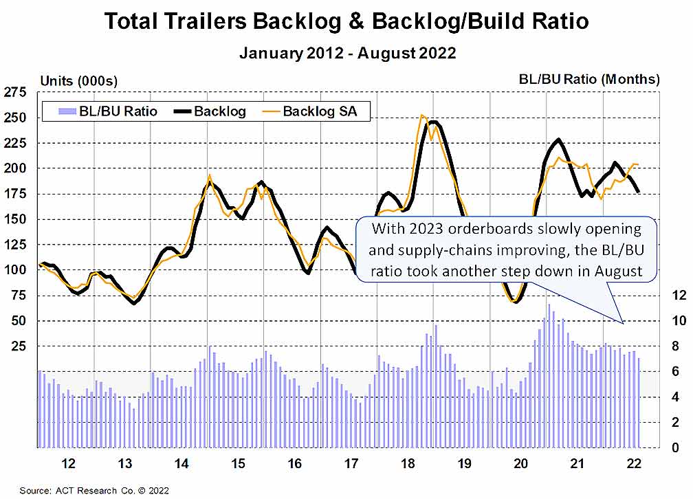 “While manufacturers continue to wrestle with rolling supply-chain disruptions, as well as challenges on the labor front, tangible improvements are being made,” McNealy said. “OEMs are investigating longer-term supply solutions, including but not limited to increased parts inventories and automation to offset labor pains, in hopes of getting ahead of potential future disruptions. Demand remains strong, cancellations remain insignificant as fleets in queue plan to stay in line, and we’re beginning to hear about price stabilization accompanying the smoother flow of materials in the supply chain.”