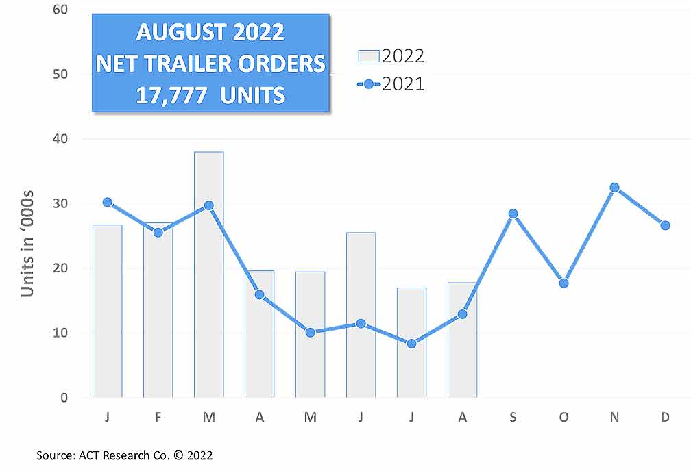 COLUMBUS, Ind. — August net U.S. trailer orders of 17,777 units were 4.6% higher compared to last month, but more than 37.7% above last year’s August level, according to this month’s issue of ACT Research’s State of the Industry: U.S. Trailers report.