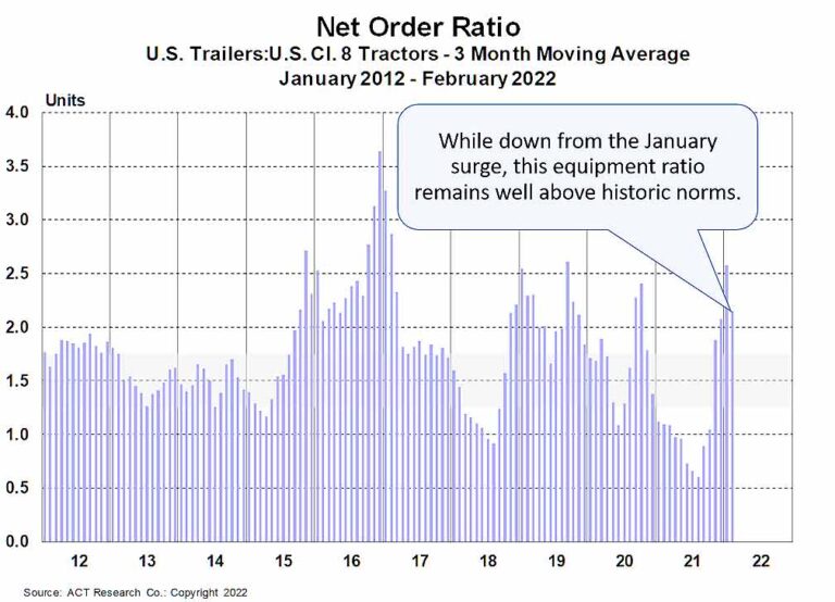 “Some reports indicate that fleets are willing to make sizeable commitments that would extend well into 2023, but it seems OEMs are not particularly willing to push the order board to those extremes,” Maly said. “Support from the supply chain, as OEMs attempt to ramp output, will be the controlling factor on any order surge.”