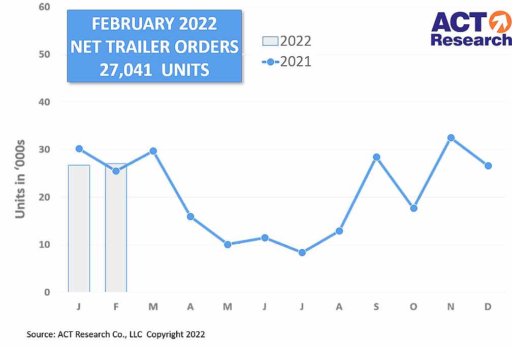 COLUMBUS, Ind. – February net US trailer orders of 27,041 units increased about 1% from the previous month and were 6% higher compared to February of 2021.