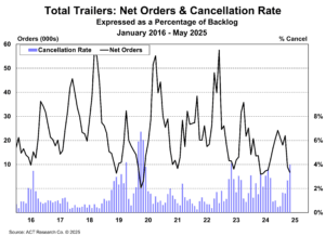 COLUMBUS, Ind. — The net U.S. trailer order intake in May was just above 6.6k units, down more than 26% from April but about 12% higher than the subdued level of orders accepted last May, according to this month’s issue of ACT Research’s State of the Industry: U.S. Trailers report.