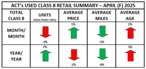 “Used truck sales continue to be shaped by considerations from outside the industry,” Tam said. “For example, April’s slightly lower activity may coincide with lower freight volumes. Some shippers may have pulled freight demand forward in an attempt to avoid tariffs. If that is the case, then the drop in volume is reflective of reduced demand for used trucks in the near term.”