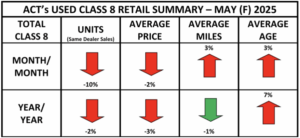 “The used truck market is awash in uncertainty that seems to have a stranglehold on both buyers and sellers,” Tam said. “The phrase analysis paralysis comes to mind. Parties on both sides of the used truck sales transaction are wondering about everything from tariffs to the status and future of emissions regulations to inventory levels. Of course, top of mind is how and when these dynamics will impact prices.”