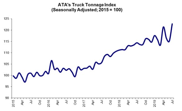 “Tonnage in 2019 has been on a rollercoaster ride, plagued with large monthly swings, which continued in July as tonnage surged after falling significantly in May and June,” said ATA Chief Economist Bob Costello. “However, take out the month-to-month noise, and you see that truck tonnage is still on a nice upward path. It is important to note that ATA’s tonnage data is dominated by contract freight, which is performing significantly better than the plunge in spot market freight this year.”