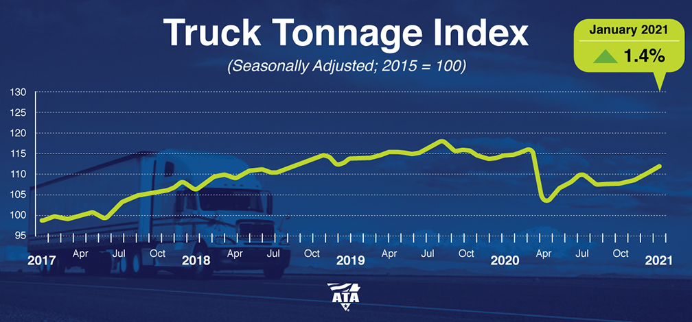 ARLINGTON, Va. — American Trucking Associations’ (ATA) advanced seasonally adjusted For-Hire Truck Tonnage Index increased 1.4% in January after rising 1.2% in December. In January, the index equaled 114.6 (2015=100) compared with 113.1 in December. ATA recently revised the seasonally adjusted index back five years as part of its annual revision.