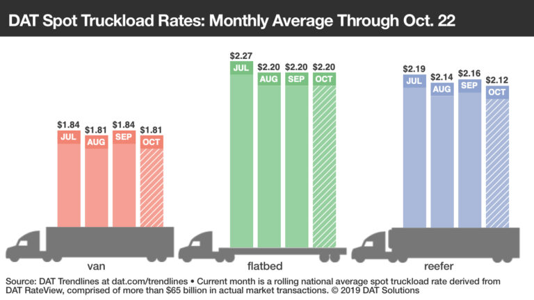 This weekly spot-rate snapshot is derived from DAT RateView, which provides real-time reports on spot market and contract rates, as well as historical rate and capacity trends. The RateView database is comprised of more than $65 billion in annualized freight payments. DAT load boards average 1.2 million load searches per business day.