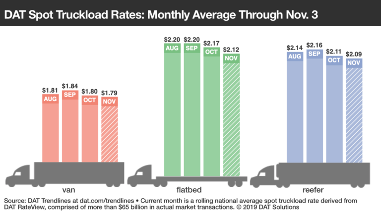 Rates during the first three days of November were lower than October averages but were unchanged compared to the previous week: van, $1.79 per mile; flatbed, $2.12; and reefer, $2.09.