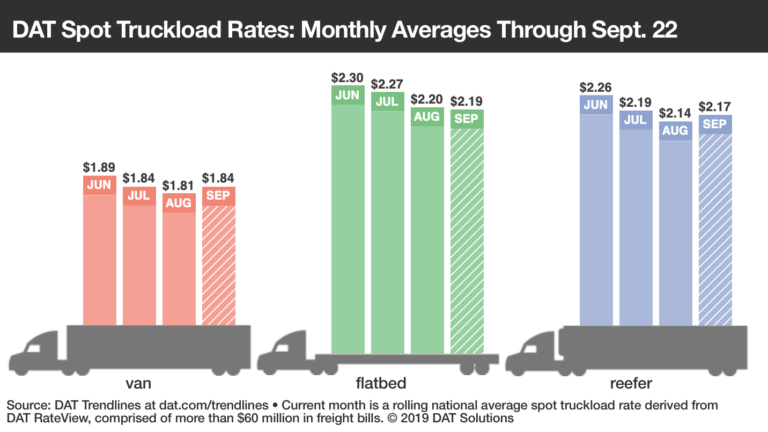 Meanwhile, as the effects of Hurricane Dorian continue to fade, demand for trucks fell in the Southeast. Atlanta to Charlotte dropped 17 cents to $2.21 per mile, and Atlanta to Miami fell 13 cents to $2.54 per mile