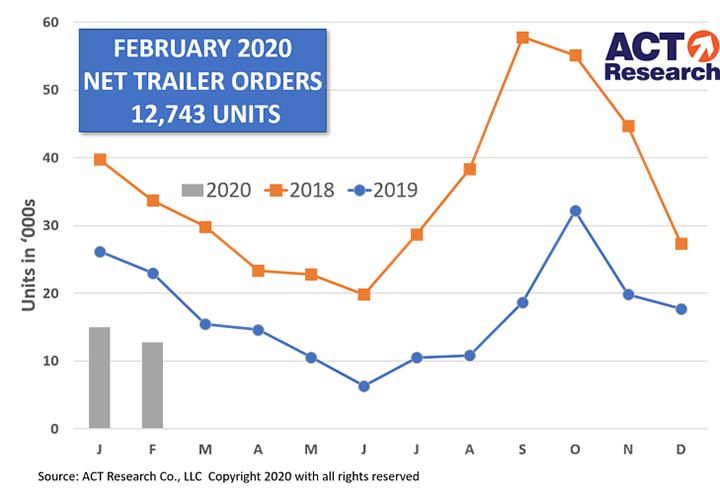 COLUMBUS, Ind. – February net US trailer orders of 12.7k units were down 15% month over month and 45% below the previous year. Before accounting for cancellations, new orders of 14.8k were down 12% versus January, according to this month’s issue of ACT Research’s State of the Industry: U.S. Trailer Report.