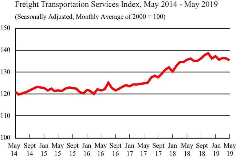 WASHINGTON — The Bureau of Transportation Statistics’ Freight Transportation Services Index (TSI), which is based on the amount of freight carried by the for-hire transportation industry, fell 0.7% in May from April, falling for the second consecutive month. From May 2018 to May 2019, the index declined 0.2% compared to a rise of 8.6% for the previous year.