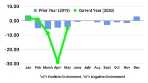 BLOOMINGTON, Ind. — FTR’s Trucking Conditions Index reading for May rebounded from its worst-ever level in April to a reading of -5.19. While much improved, May’s reading is still quite negative from a historical perspective. A sharp increase in freight was primarily responsible for the improvement, as rates and utilization were still weak.