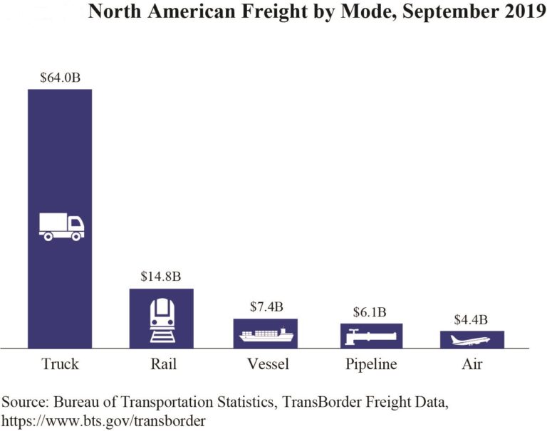 The U.S. Department of Transportation (DOT) has released its September 2019 North American Transborder Freight Numbers, and the data indicates the trucking industry hauled over 432% more freight than its nearest modal competitor, railways. Â The data includes shipping between the U.S. and Canada and the U.S and Mexico.