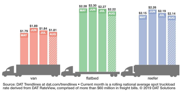 The national average van load-to-truck ratio dropped from 2.2 to 2.1. That’s nearly a full point lower than the August 2018 average.