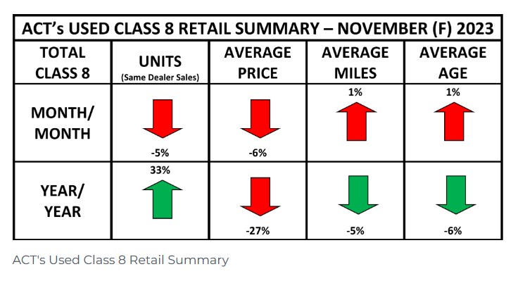 COLUMBUS, Ind. — According to the latest State of the Industry: U.S. Classes 3-8 Used Trucks by ACT Research, the used Class 8 average retail sale price fell 6% month-over-month to $59,300 in November, marking the first month of a sub-$60,000 price since April 2021.