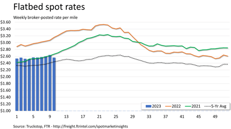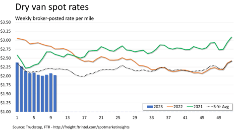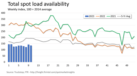 The total broker-posted spot market rate declined just over 5 cents. Total rates were about 20% below the same 2022 week but more than 2% above the five-year average. FTR estimates that rates excluding a calculated fuel surcharge were about 21% below the same 2022 week.