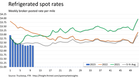 Refrigerated spot rates declined about 4 cents, which was the same scope as the increase in the previous week. Rates were about 25% below the same 2022 week and nearly 6% below the five-year average for the week. Excluding fuel surcharges, rates were about 28% below the same week last year. Refrigerated loads fell 11%.