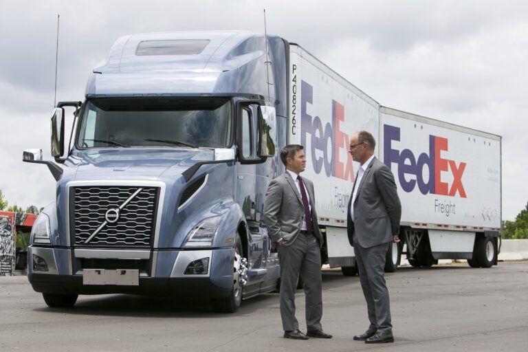 IMAGE DISTRIBUTED FOR VOLVO TRUCKS - Beau Memory, Executive Director of the NC Turnpike Authority, NCDOT, left, and Per Carlsson, President Volvo Trucks North America during an event Wednesday in which Volvo Trucks North America, in collaboration with FedEx and the North Carolina Turnpike Authority, successfully demonstrated on-highway truck platooning as part of ongoing research collaboration. The "platoon" consisted of three Volvo tractors, pulling double 28 ft. trailers, connected through wireless vehicle-to-vehicle communication technology to help reduce the reaction time for braking and enabling the vehicles to follow closer, automatically matching each other's speed and braking. The event took place on N.C. 540 Wednesday, June 27, 2018, in Apex, N.C. (Justin Kase Conder/AP Images for Volvo Trucks)