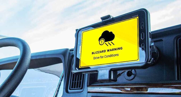 In cab alerts with messages like “Snow Squall Warning, Drive for Conditions” are displayed on the ELD.