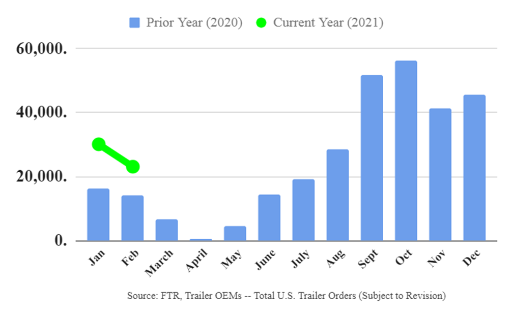 Although orders fell, the figure is still 64% above February last year. February order activity is very consistent with seasonal trends, following a record-setting fourth quarter in 2020, according to FTR analysts.