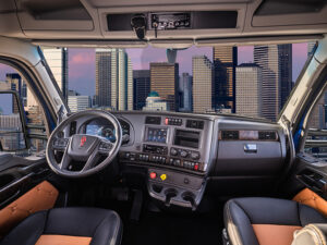 The T680 Next Gen with a Diamond VIT interior has a rich madrona insert in the door pad with black stitching to match the black door. The Diamond VIT sleeper interior has fine black Diamond panels with madrona stitching — also offered on the leather-wrapped steering wheel. T680 Next Gen with 76-inch high-roof sleepers can be spec’d with the optional Kenworth Cargo Shelf, a 5.5-inch storage shelf with multiple secure tie-down points. Two LED lights on the shelf’s underside provide lower bunk lighting.
