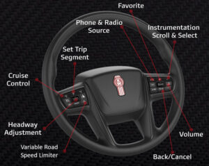 Next Gen Kenworth SmartWheel: The new standard Kenworth SmartWheel — made of polyurethane or optional leather — features intuitive controls for the new standard 15-inch digital display. Featured switches are based upon vehicle specification. The new digital instrumentation system allows seamless viewing selection between two minimized views, basic view, maximized view, and even a driver-customizable favorites view. Drivers can easily scroll up and down this hierarchy using the standard Next Gen Kenworth SmartWheel, which also puts cruise control and radio functions at the driver’s fingertips.