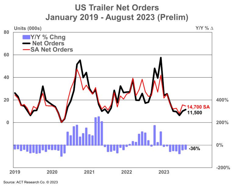 COLUMBUS, Ind. — According to a preliminary report released by ACT Research, net trailer orders for August increased sequentially, to 11,500 units, but were lower against longer-term comparisons. Because August is one of the weakest order months of the year, seasonal adjustment boosts the tally to 14,700 units.