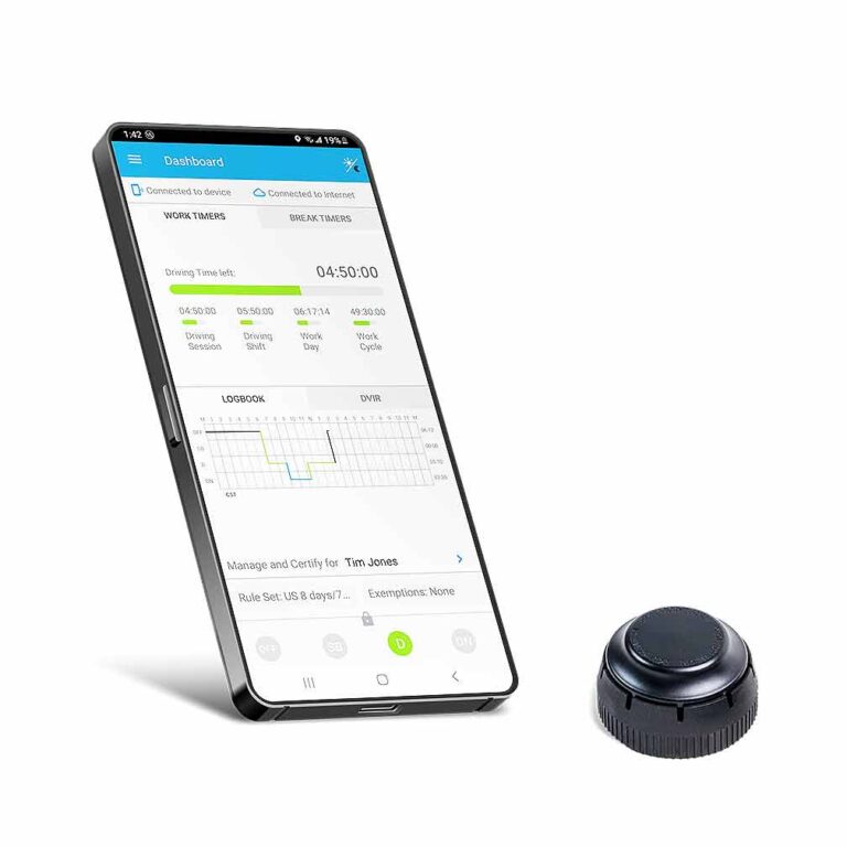 Vehicle Link is a small electronic logging device that installs in seconds. Measuring 1.5 inches in diameter, it plugs into a truck’s diagnostic port and pairs with the Rand VL app on an Android phone or tablet.