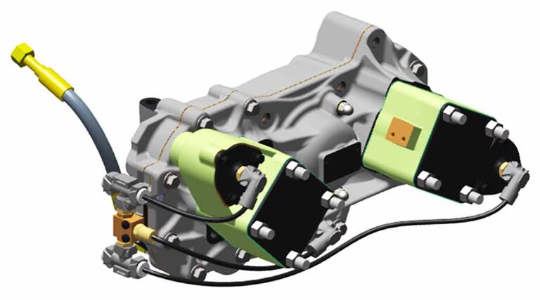 The new dual PTO allows I-Shift to incorporate two independently clutched DIN 5462 drives, or one SAE 1410 flange and one DIN 5462 drive, separated by the vehicle’s centerline. By separating the two drives, space is created to allow for the installation of two pumps, simplifying installations and serviceability in the field. The output drives are independently clutched, enabling the vehicle to serve applications either separately or simultaneously.