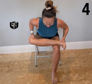 - Pull your left thigh toward you or gently lean forward if seated (Fig. 4).