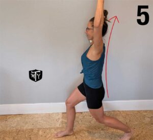 - Reach your back-leg arm overhead and press your hips away from the wall/truck (Fig. 5).