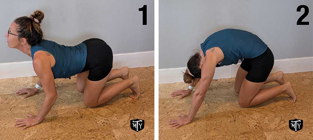 - Exhale: Round your spine and tuck your chin and tailbone (Fig 2).