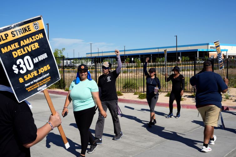 Since late June, dozens of Amazon drivers and dispatchers who work for a California-based delivery firm that the Teamsters unionized in April have been picketing company warehouses as far out as Michigan and Massachusetts, calling on the e-commerce behemoth to come to the table and bargain over pay and working conditions.
