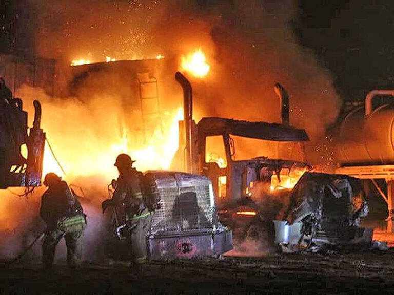 Firefighters were dispatched to the scene at around 11 p.m. and found both big rigs fully engulfed in flames.