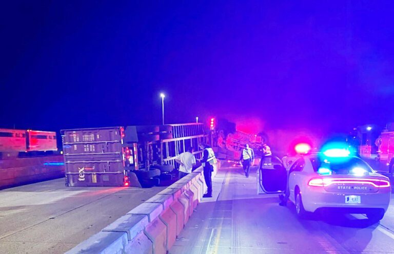 “The semi continued to travel over the wall and overturned, coming to a rest on its driver’s side,” an ISP report stated. “The semi also struck some construction equipment that was being operated by two construction workers. The Taurus came to a rest in the right ditch.”