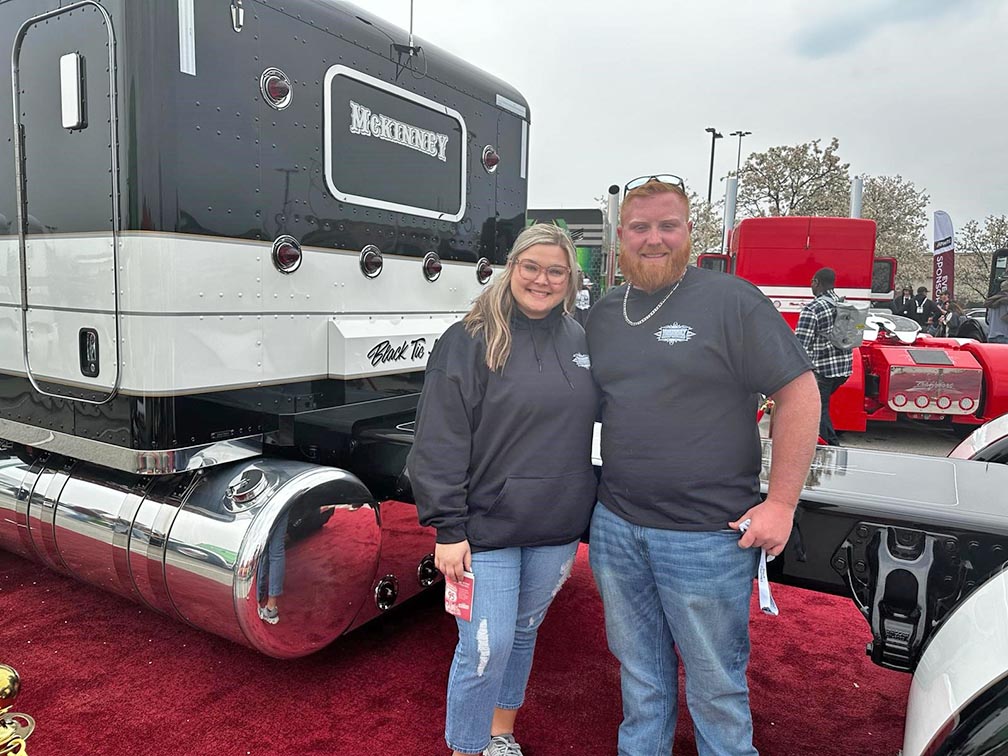 Dill McKinney and his girlfriend, Yasmine Twilley, pose in front of McKinney's rig "Black tie Affair." (The Trucker Staff/Linda Garner-Bunch)