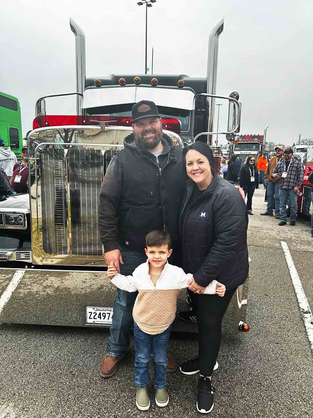 The Landrys -- Jarret, left, Jessica and Knox -- and are pictured in front of their 1988 Peterbilt 389. (The Trucker Staff/Linda Garner-Bunch)