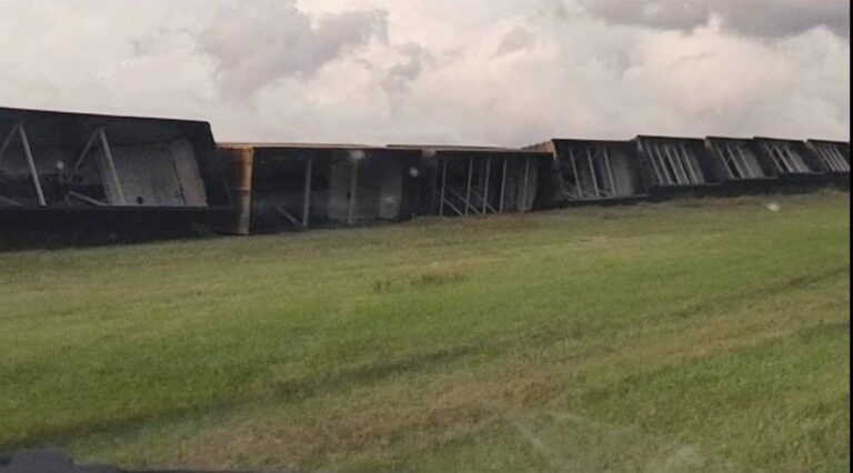 BNSF Railway spokesperson Kendall Sloan said a train was stopped due to a tornado warning Wednesday night, Aug. 28, near the town of Steele, North Dakota, when high winds caused 43 empty coal cars to derail.