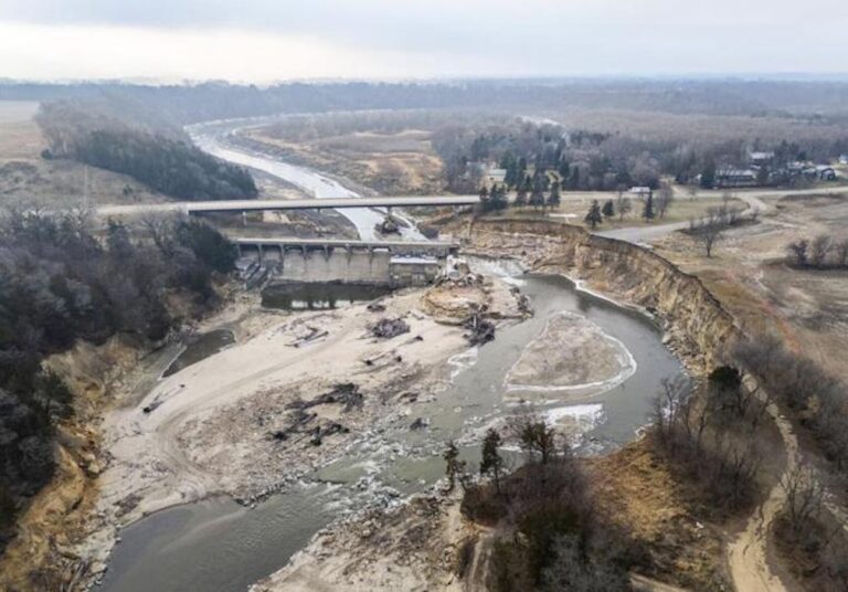 The river’s water levels rose dramatically in late June and early July after heavy rain pummeled the Midwest for days. While the structures held up in the end, floodwaters forged a new river channel around the dam and cut deeply into a steep riverbank, toppling utility poles, wrecking a substation, swallowing a home and forcing the removal of a beloved store.