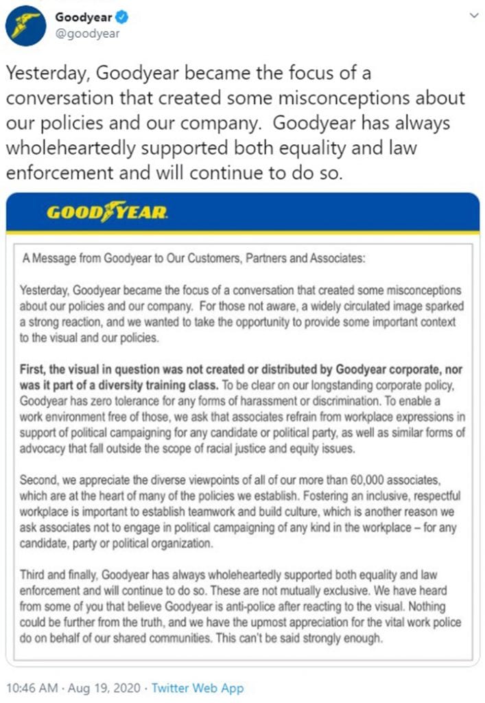 Shortly afterward, Goodyear responded with a tweet stating “the visual in question was not created or distributed by Goodyear corporate, nor was it part of a diversity training class.” The tweet goes on to note that the company asks its associates to “not to engage in political campaigning of any kind in the workplace — for any candidate, party or political organization.”