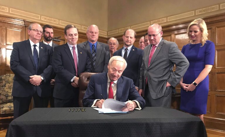 LITTLE ROCK, Ark. — Arkansas’ governor on Tuesday signed a $95 million highway funding bill that will raise fuel taxes for the first time in 20 years, setting up an election year fight over a plan to ask voters to keep paying a half-cent sales tax for road needs.