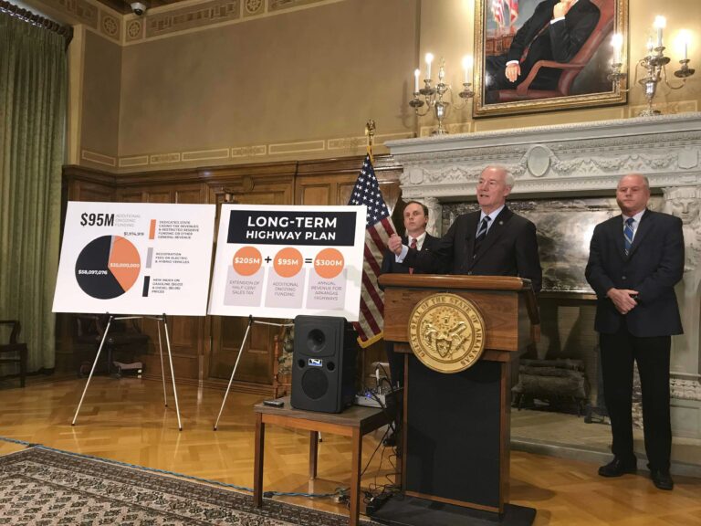 LITTLE ROCK, Ark. — Arkansas’ governor on Monday unveiled a $300 million highway funding plan that calls for increasing taxes and tapping into expected casino revenue, hoping to win over fellow Republicans who have said they want to address road needs before taking up his proposed income tax cut.