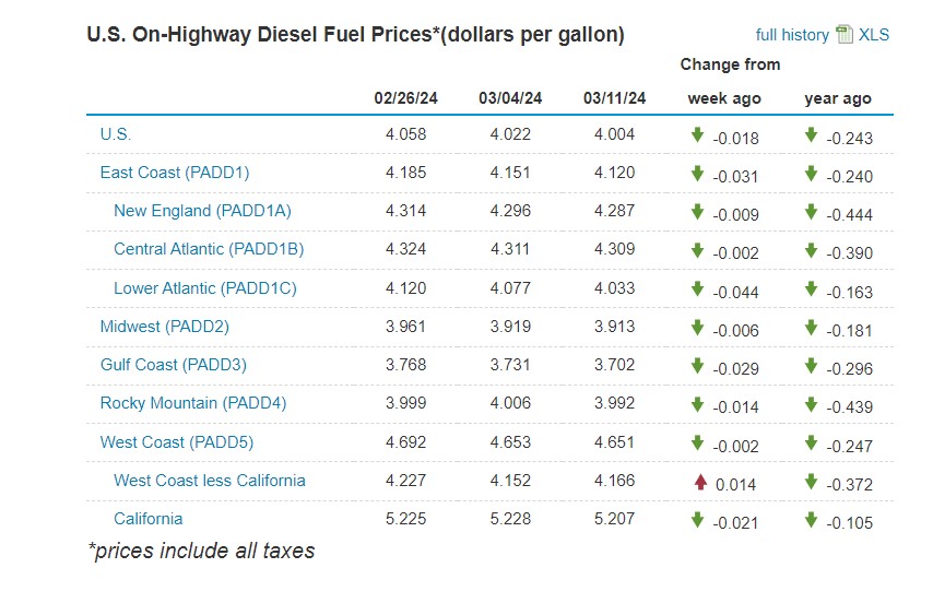 LITTLE ROCK, Ark. — U.S. diesel averages are down in every part of the country except the West Coast — not including California — according to the latest report from the Energy Information Administration (EIA).