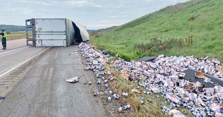 JACKSON COUNTY, Wis. — A semi truck full of beer overturned just after 9 a.m. on Wednesday along Interstate 94 near the Hixton community in Wisconsin, strewing cans of foamy brew on the shoulder.